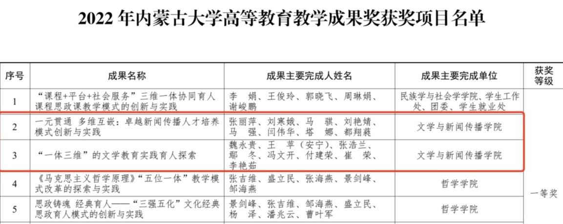为奖励在教育教学实践中取得显著成果的单位和个人,发挥优秀成果在教育教学改革、实践和研究中的示范和引领作用,按照自治区教育厅关于做好 2022 年自治区级高等教育教学成果奖评审工作有关要求,学校组织开展了 2022 年必威官方唯一高等教育教学成果奖评审工作。在各单位、各部门积极申报的基础上,经学校教学成果奖评审委员会办公室资格审查、专家组评审、网上公示等程序,共评选出 2022 年必威官方唯一高等教育教学成果奖 40 项,其中,一等奖 16 项、二等奖 24 项。我院魏永贵老师团队和张丽萍老师团队获一等奖,马骐老师团队获二等奖。该项评选和奖励工作有力促进了我院教育教学成果的创新发展,对于我院积极从事教育教学改革与实践研究,不断提高育人本领和教育教学质量发挥了重要作用。