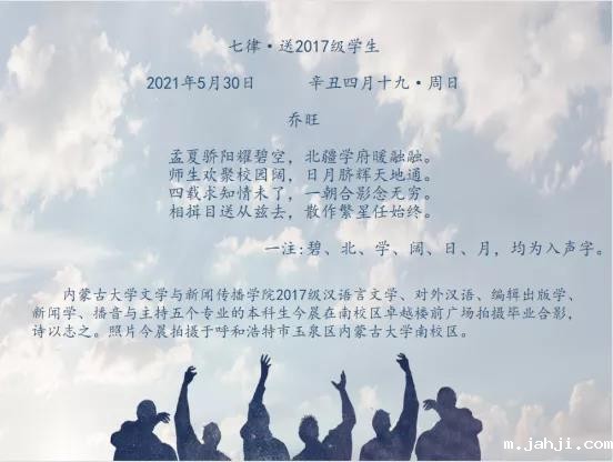 晚会现场也收到了来自老师们的视频祝福,让我们一起来看一下。乔旺老师送给毕业生一首七律诗,祝愿毕业生们前程似锦,幸福一生!
